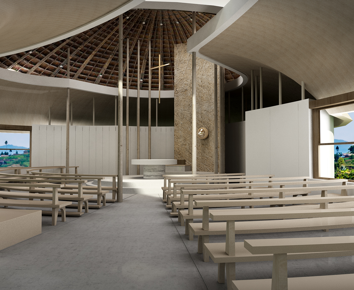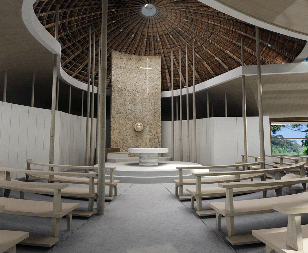 Toàn bộ không gian nội thất của nhà nguyện được bố trí theo các vòng tròn đồng tâm, thể hiện sự lan tỏa của bình an khi con người bước vào nhà nguyện, chiêm ngưỡng vẻ đẹp của thiên nhiên và lắng nghe lời Chúa từ sâu thẳm tâm hồn mình.