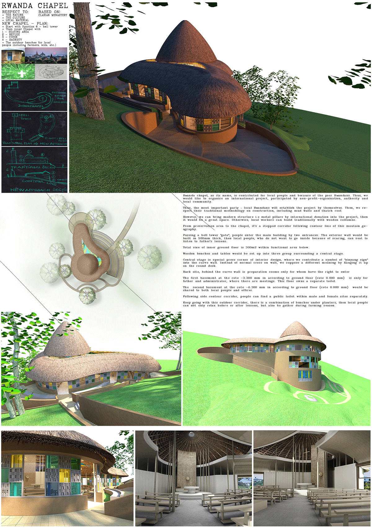 Ý tưởng thiết kế của chúng tôi có thể giống với nhiều đội ngũ khác—đó là tận dụng địa hình đồi lớp của Rukomo để đề xuất phương án thiết kế, kết hợp sử dụng vật liệu bản địa hoặc kiến trúc truyền thống Rwanda cho dự án “Rwanda Chapel”. Nhưng chúng tôi tin rằng cách chúng tôi đi tìm một “thánh đường” bản địa thực sự là một hướng tiếp cận khác biệt.