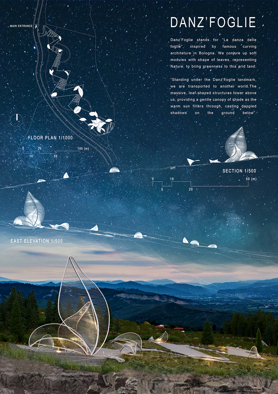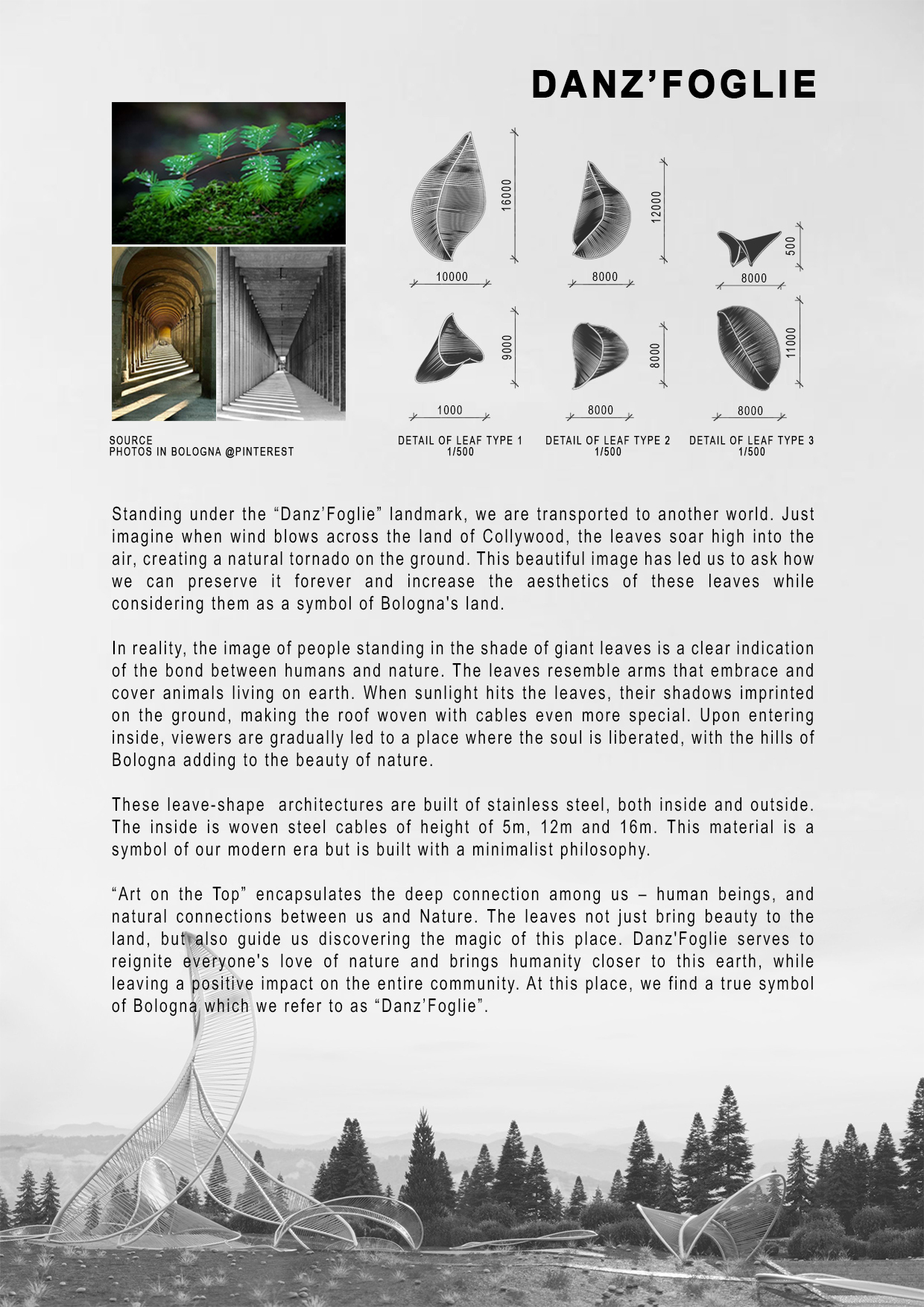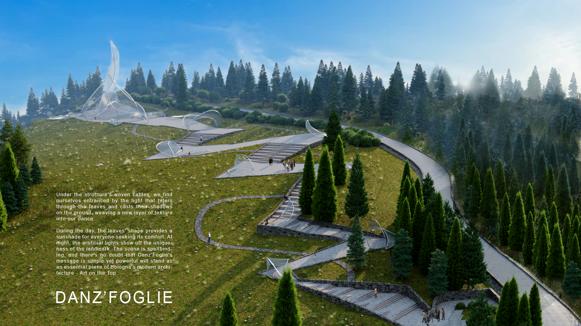 “Art on the Top” được chúng tôi gửi gắm thông điệp về sự gắn kết giữa con người với nhau và con người với thiên nhiên. Sự góp mặt của những “chiếc lá” làm tăng tính thẩm mỹ của khu đất và góp phần giúp cho chúng ta khám phá hết được vẻ đẹp nơi này, nơi chứa đựng một biểu tượng khi nhớ về vùng đất Bologna, được mang tên “Danz’Foglie”.